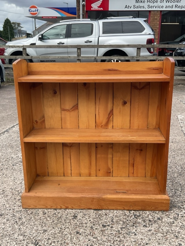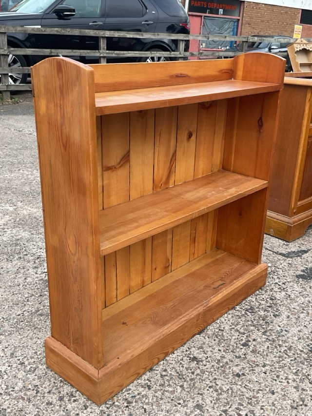 A pine open bookcase with arched sides framing three shelves, supported on a plinth. (34.5in)