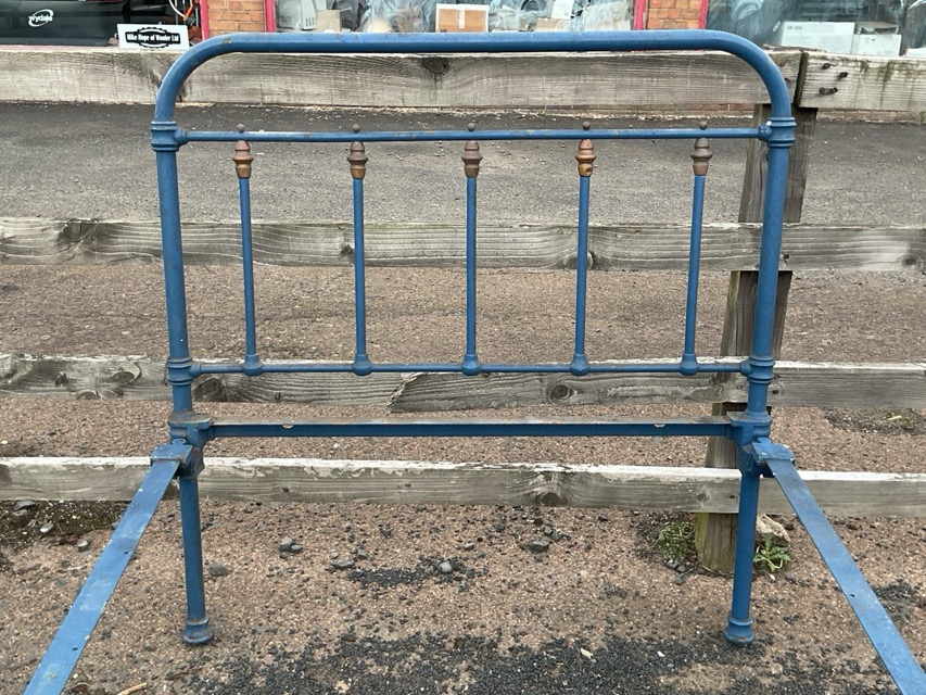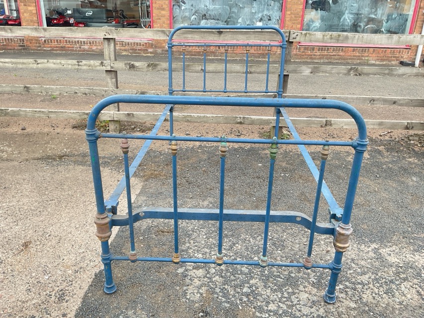 A Victorian painted iron bed with brass mounts, having tubular rounded headboard & tailboard framing spindles, joined by angleiron side rails supporting pine slatted base. (42in)