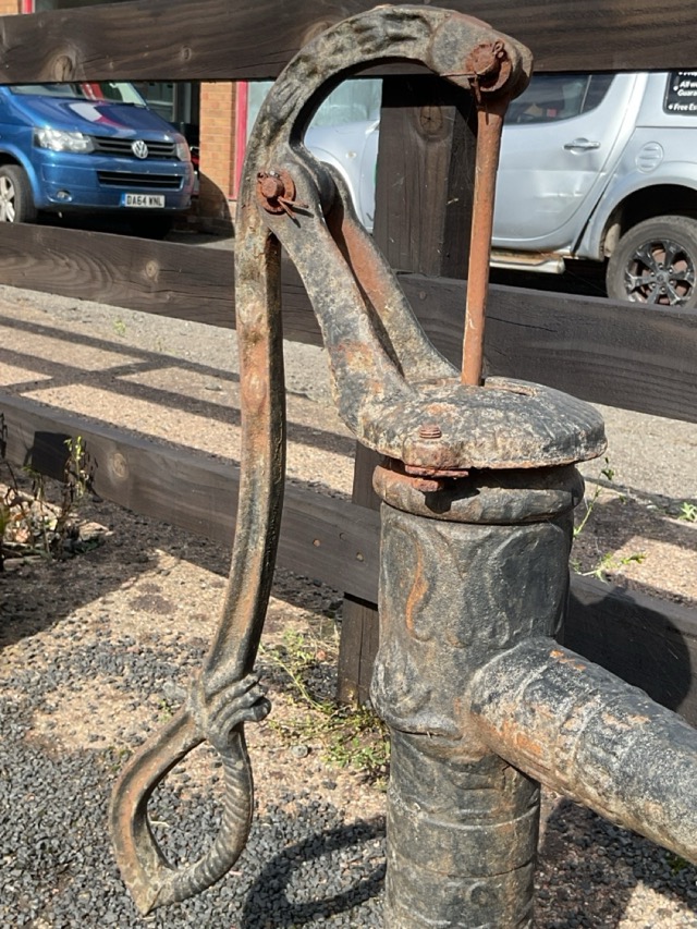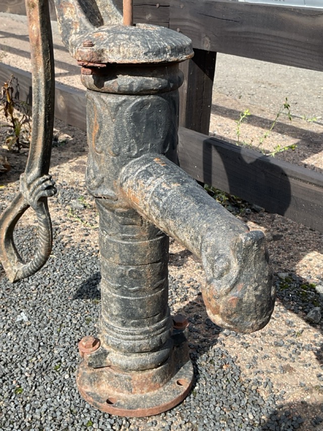 A Victorian style cast iron garden pump with tapering spout to column with flange base, the handle of sword shape. (25.5in)