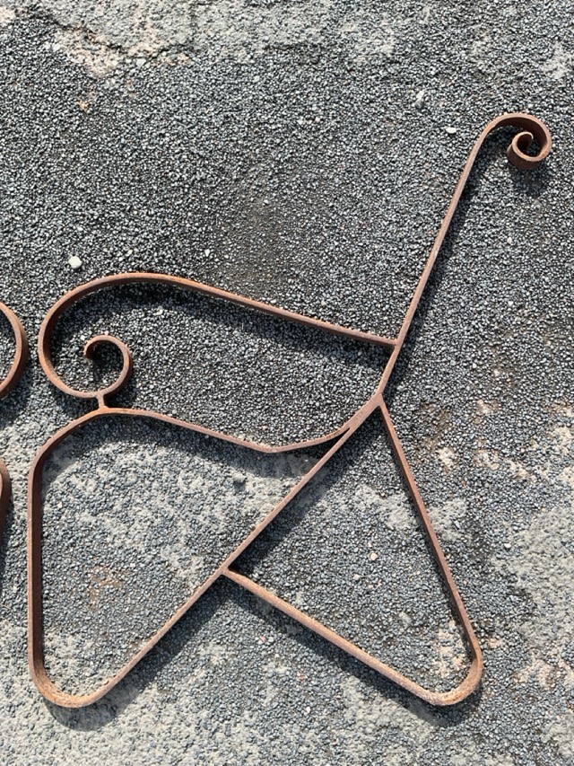 A pair of hand-forged wrought iron bench ends with scrolled backs & arms on angled supports. (2)