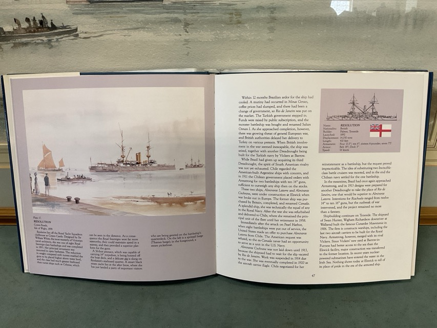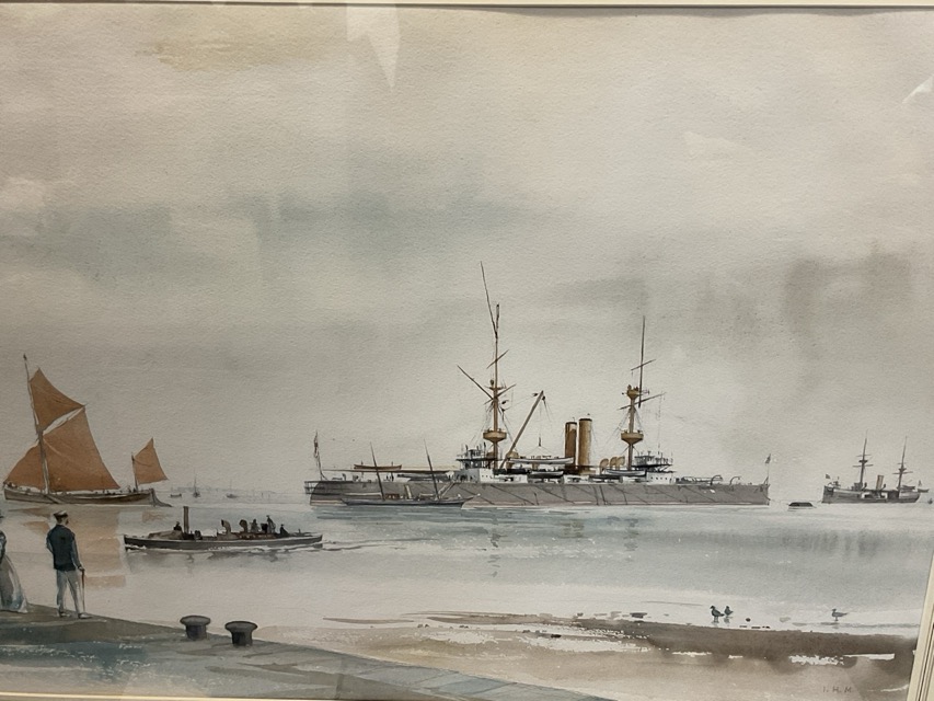 Ian Marshall, watercolour, study of the battleship HMS Resolution & Colossus off Cowes in the Isle of White, with other boats and figures on quayside, signed with monogram, mounted & framed, complete with illustrated volume by the artist. (28in x 20.5in)