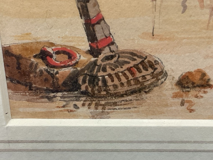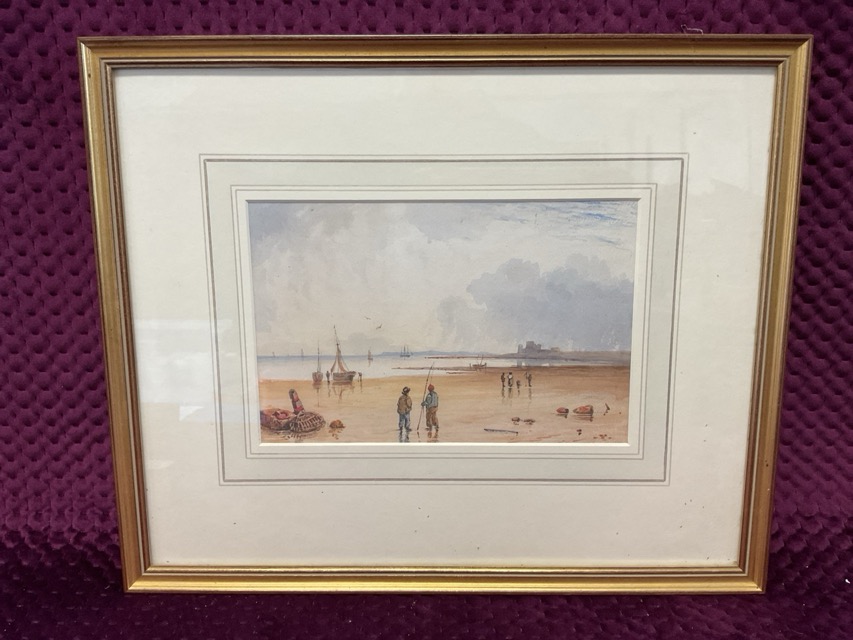 Frederick Bourgeuis de Mercey, C19th watercolour, coastal view with figures on beach and distant castle, signed with initials, mounted & framed - Sinfield Gallery label to verso. (9.25in x 6in)