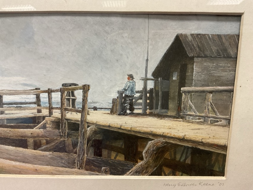 Henry Keene, watercolour, coastal pier with hut & figures, inscribed on mount and to verso, mounted & framed. (11in x 4.5in)