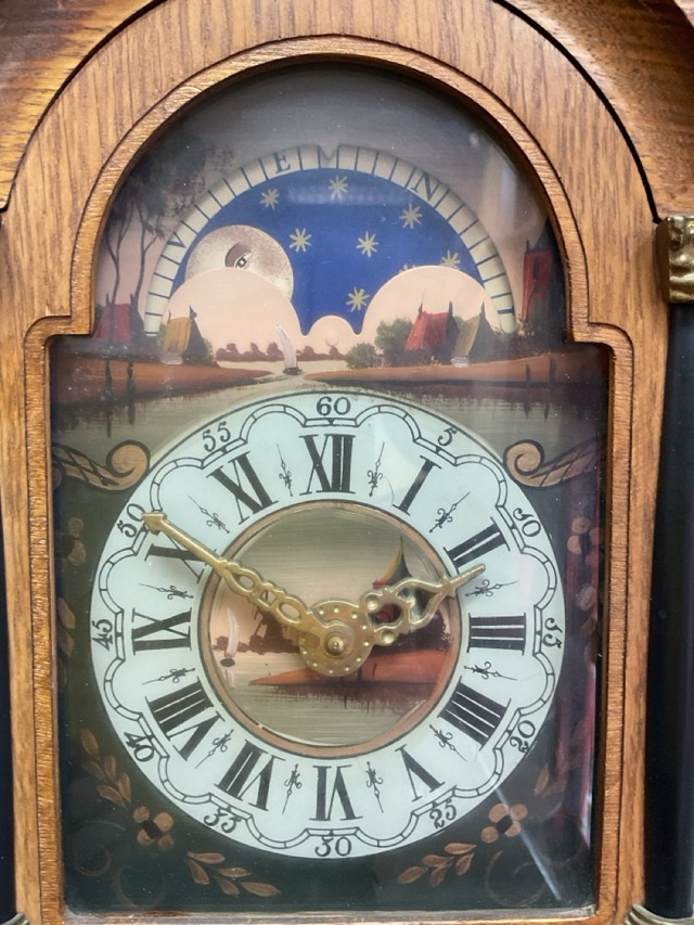 A European black forrest type wallclock surmounted by brass Atlas & cherubs, the domed case with ebonised pillar mounts enclosing a painted moon phase dial, having brass weights & pendulum below. (33in)