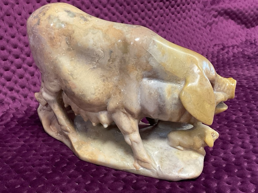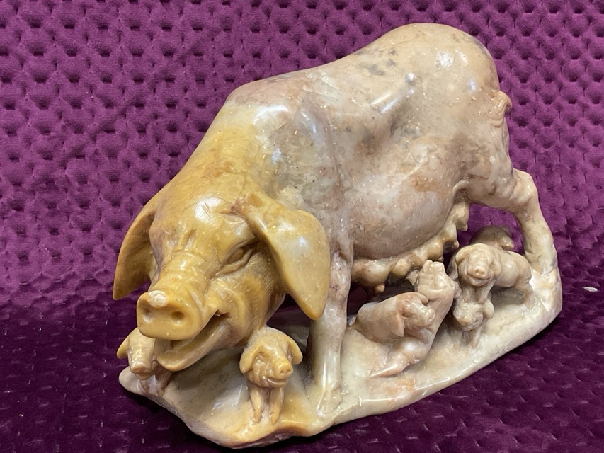 A nineteenth century carved soapstone sow with piglets, on carved hardwood stand. (9.5in)