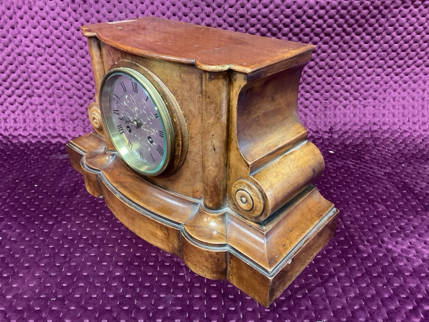 A C19th walnut mantle clock with architectural style case on moulded plinth, the French eight-day movement having brass scroll engraved dial with roman chapters. (14in)