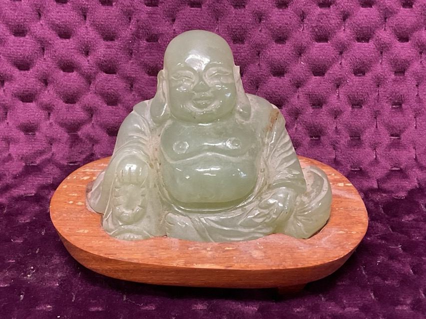 A carved jade seated buddha on hardwood fitted stand. (4in)