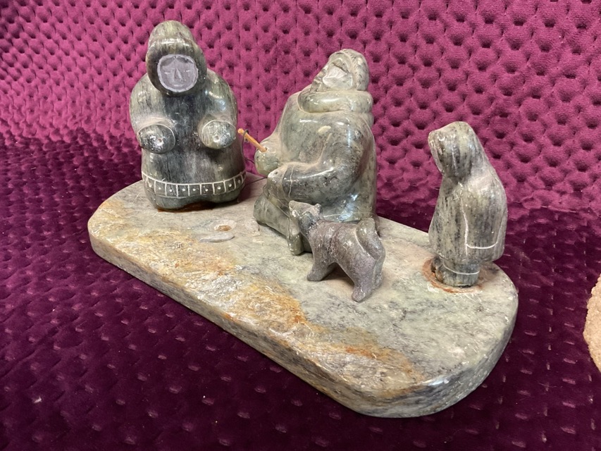 A carved soapstone Inuit group with three figures fishing with dog, mounted on rectangular rounded plinth; and a resin group of three penguins. (2)