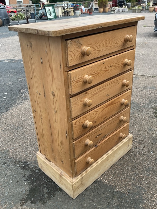 A pine chest of six knobbed drawers supported on a moulded plinth. (24in x 13.75in x 35in)