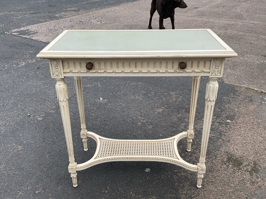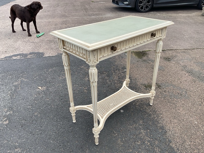 A painted ladies writing desk with gilt tooled leather skiver to rectangular moulded top, having fluted frieze drawer raised on leaf carved tapering ribbed legs joined by caned panelled stretcher - purchased Harrods 1970s. (29.5in x 16in x 29in)