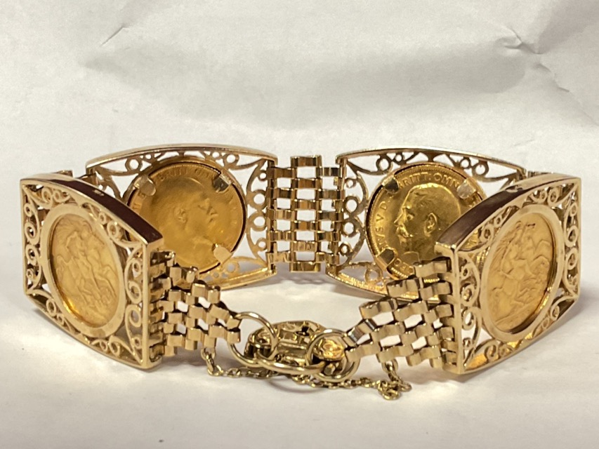A 9ct gold bracelet set with four half sovereigns in panels - 1904, 1905, 1908 & 1914, joined by gate links with padlock safety chain. (39.9g)