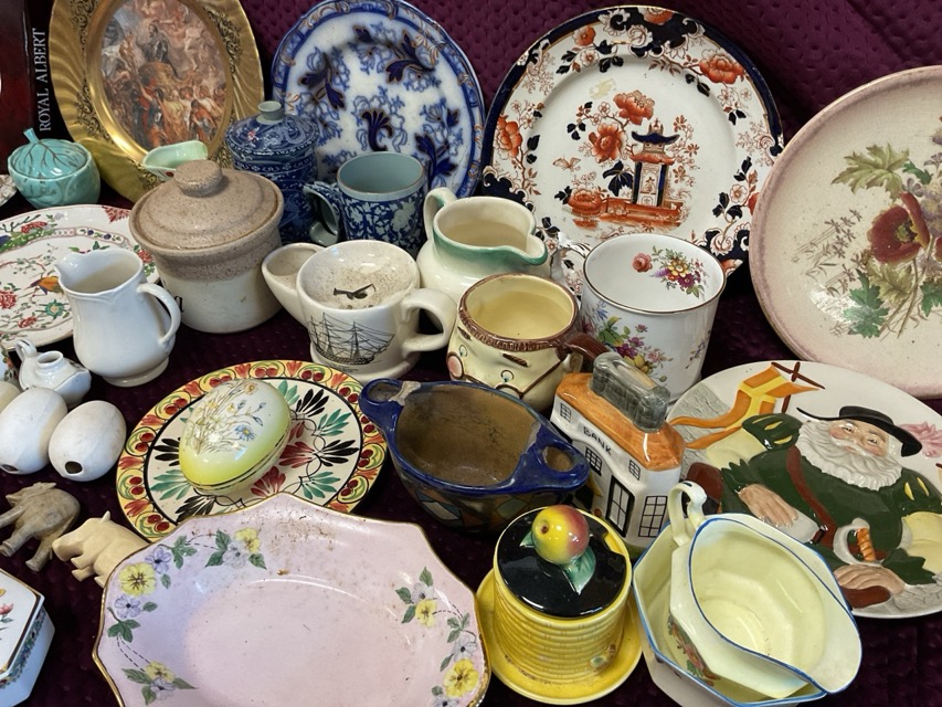 Miscellaneous ceramics - handpainted pieces, a Bavarian Rubens gilt cabinet plate, a shaving mug, Quimper, stoneware, tankards, a Doulton jug, some Victorian, a Hammersley floral cup, a Goebel honeypot & cover, Coalport, etc. (A lot)