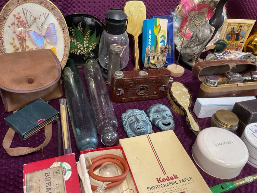 Miscellaneous collectors items - cameras, irons, painted wood ducks, pens, a papiémaché plate,boxed darts, an old account book, two glass rolling pins, brushes, etc. (A lot)
