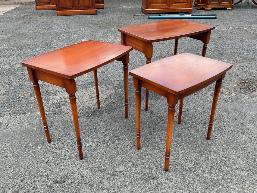 A nest of three Georgian style crossbanded yew tables with rounded rectangular tops above plain friezes, raised on turned tapering legs. (23in x 15.5in x 21in) (3)