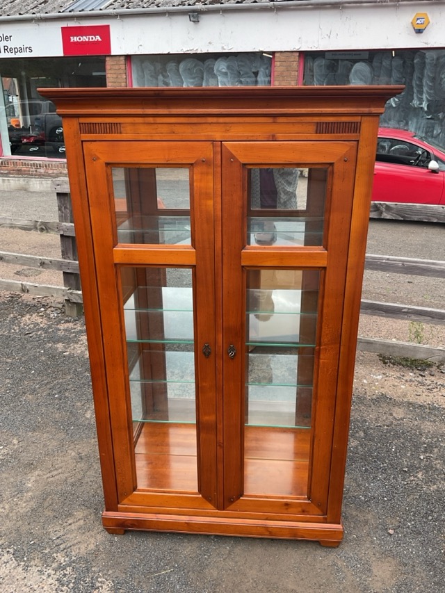 A yew display cabinet with moulded cornice and ribbed frieze above a pair of glass panelled doors enclosing shelves with mirrored back, raised on tapered block feet. (38.25in x 15in x 63in)