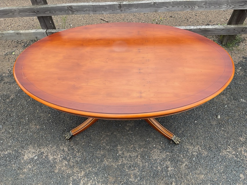 A regency style yew coffee table with oval mahogany strung moulded top on column, raised on grooved sabre legs with brass lions paw castors. (52in x 28in x 21.5in)