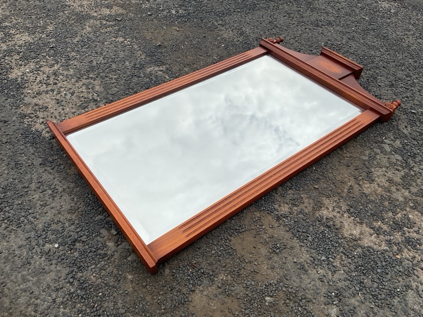A regency style yew wall mirror with shaped pediment inlaid with fan motif flanked by turned finials, above a rectangular bevelled plate between fluted pilasters. (29.5in x 33.5in)