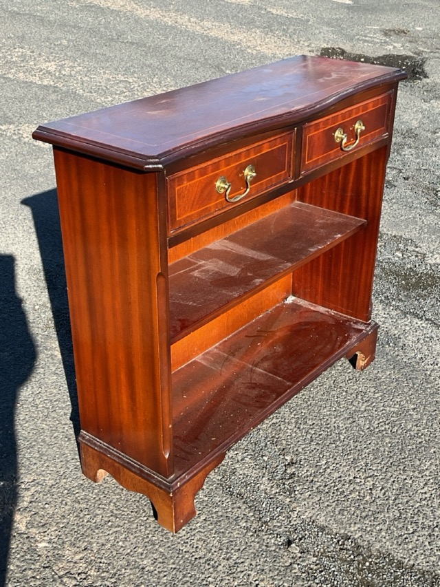 A Georgian style crossbanded boxwood strung mahogany bookcase with moulded rectangular top above a pair of brass handled frieze drawers, and two open shelves, raised on bracket feet. (31.25in x 10.5in x 29in)