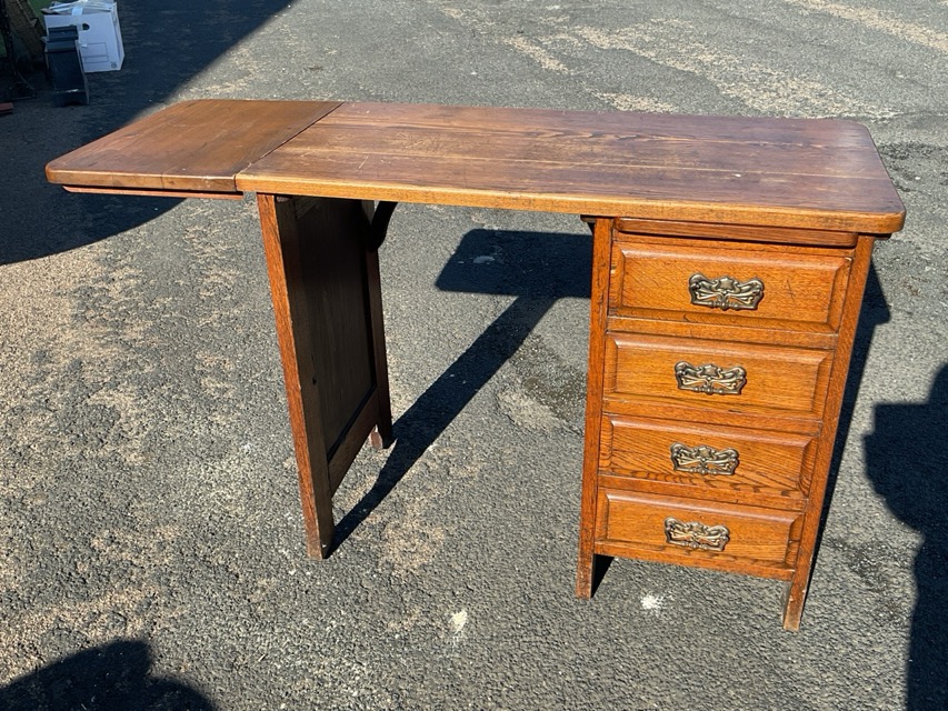 An Edwardian oak desk, the rectangular top with drop leaf above a kneehole and four brass handled drawers, raised on square legs. (45.5in x 17.5in x 26.25in)