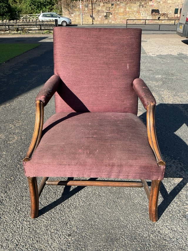 A Georgian style mahogany Gainsborough armchair with rectangular upholstered back and seat flanked by padded downswept moulded arms, raised on conforming legs joined by stretchers.