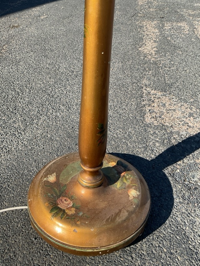 A gold lacquered standard lamp with candlelight above a turned tapering column on a dished circular base, decorated with handpainted floral sprays. (68in)