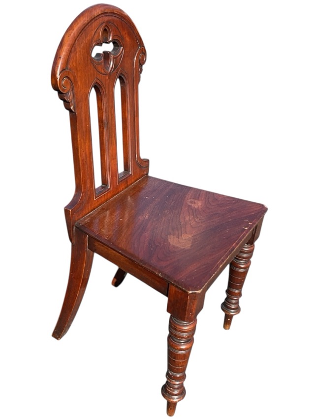A Victorian mahogany gothic hall chair with arched back pierced with quatrefoil and two lancets above a flared rectangular seat, raised on turned tapering legs.