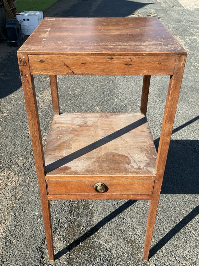 A Georgian mahogany bedside table with square top above an undershelf with brass ring handled drawer, raised on square legs. (15in x 15in x 32in)