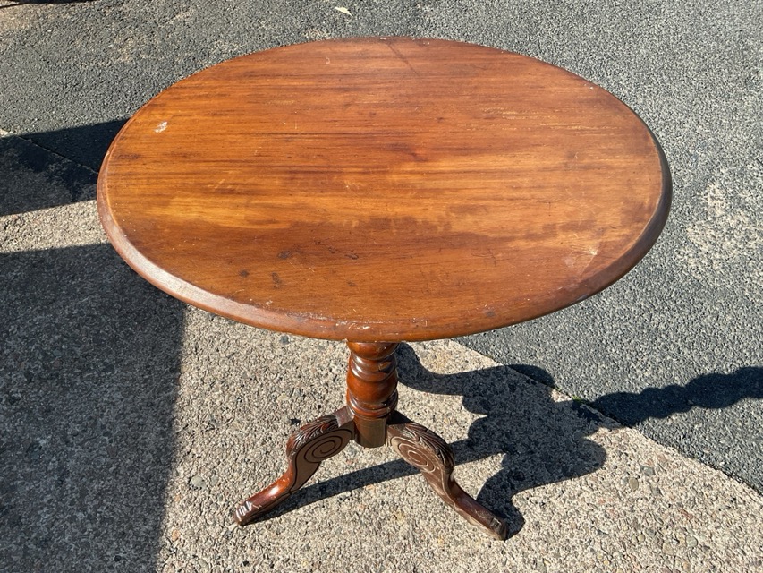 A Victorian mahogany wine table with oval top on a bobbin turned column, raised on a tripod base with scroll and leaf carved legs. (21in x 17in x 29in)