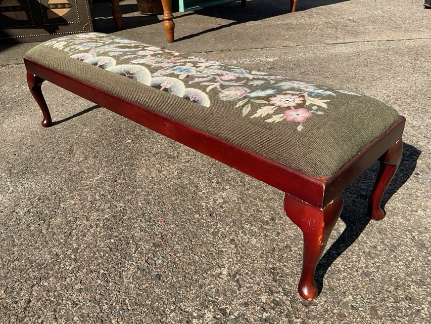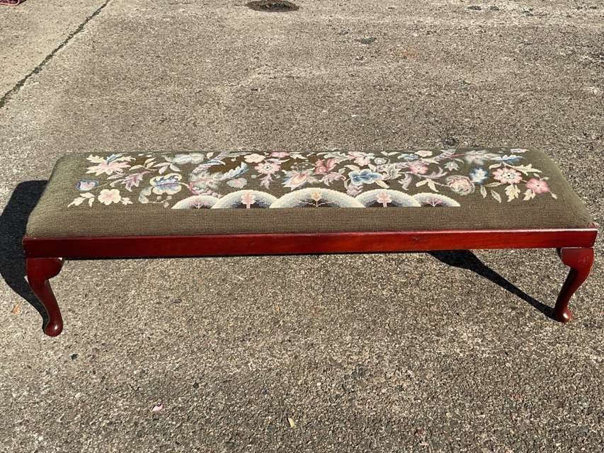 A long Georgian style stained stool with floral woolwork tapestry upholstered seat, raised on cabriole legs. (49.5in)