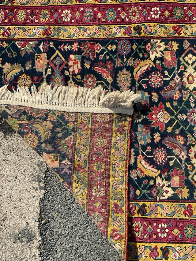A Tabriz wool runner woven with symmetrical scrolled flowers and foliage on a dark blue field, within meandering flowering vine and flowerhead borders. (41.25in x 209in)