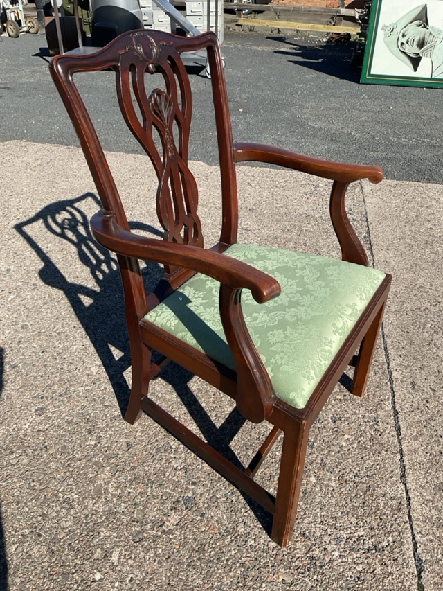 A Chippendale style mahogany armchair with foliate carved pierced splat above a drop-in upholstered seat flanked by serpentine shaped arms, raised on square legs joined by stretchers.