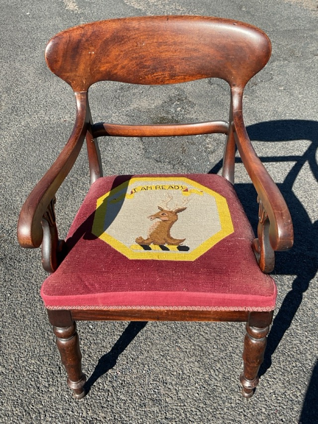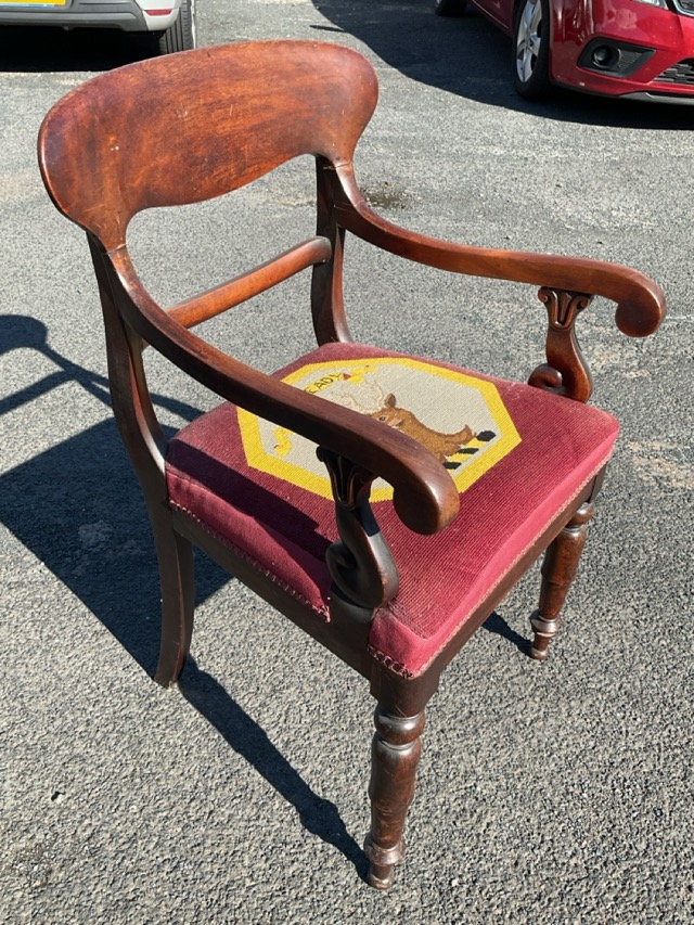 A William IV mahogany armchair with oval back and plain rail above an armorial needlework tapestry upholstered seat, flanked by downscrolled arms on lotus carved supports, raised on turned tapering legs.