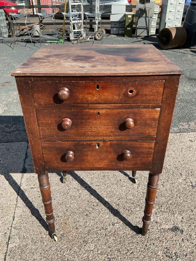 A Georgian mahogany bedside chest with rectangular moulded top above three knobbed drawers, raised on tapering ring-turned legs with brass castors. (20.5in x 18.25in x 33.75in)
