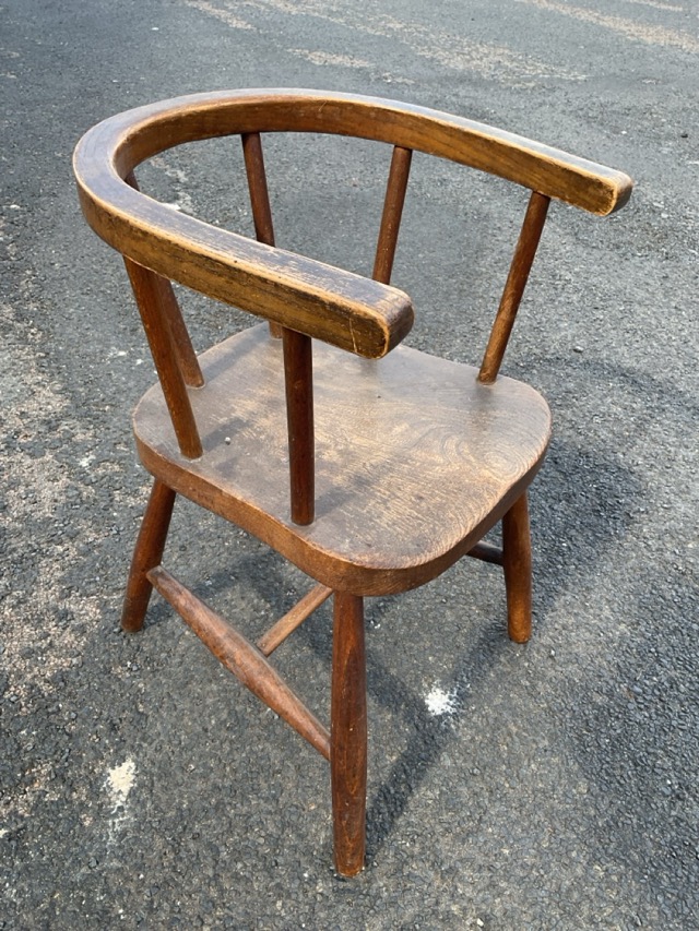 A hardwood childs armchair with horseshoe shaped back on spindle supports above a solid dished seat, raised on cylindrical legs joined by stretchers.