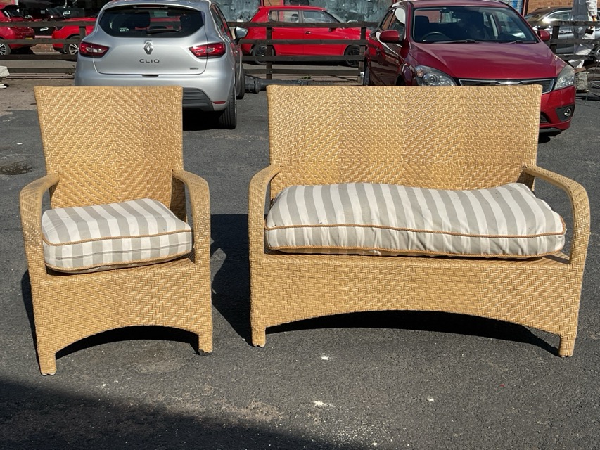 A woven faux cane two-seater patio sofa and armchair, the rectangular backs and seats with loose cushions flanked by curved arms above arched aprons, raised on rectangular feet. (2)
