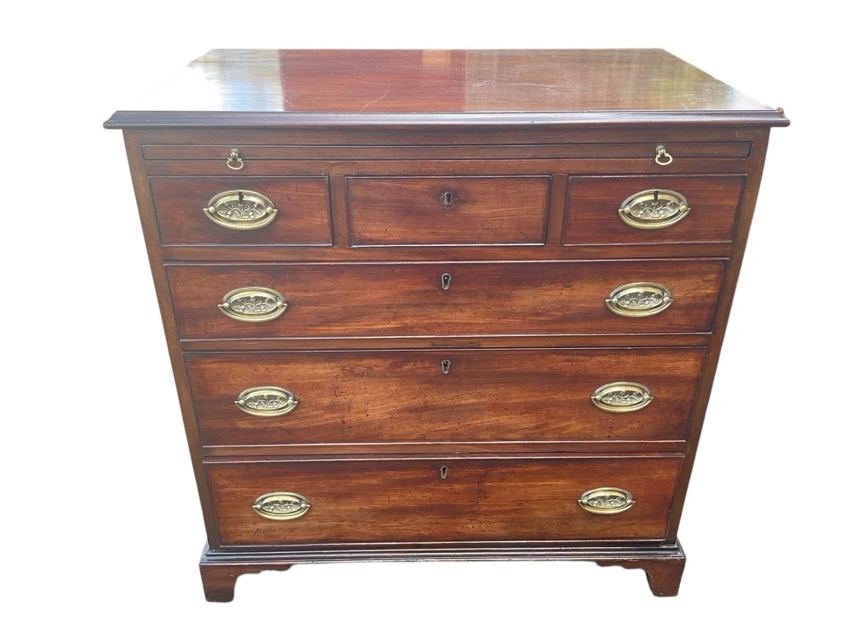 A Georgian mahogany chest of drawers with rectangular moulded top above a slide and five oval brass handled drawers, raised on bracket feet. (31in x 18in x 32in)
