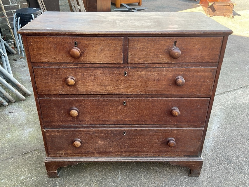A nineteenth century oak chest of drawers with rectangular moulded top above five mahogany knobbed drawers, raised on bracket feet. (40in x 18.5in x 38.5in)