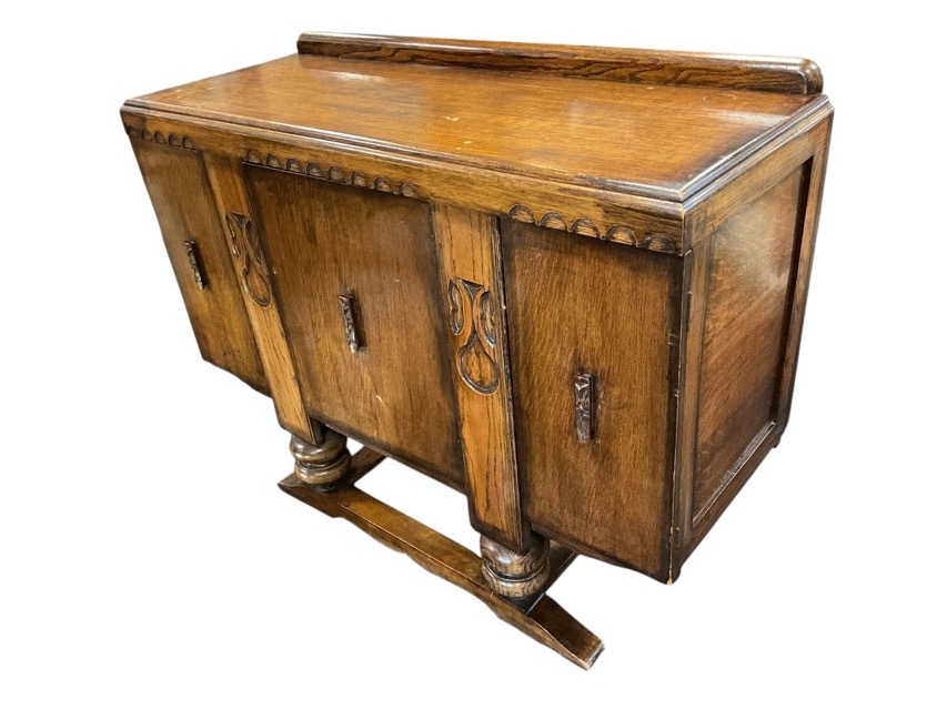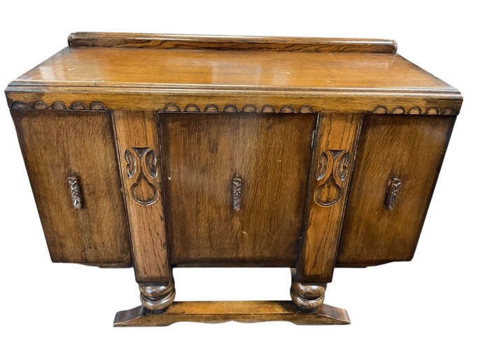 A 30s oak sideboard with raised back and rectangular top above an arcaded frieze and three doors, raised on bulbous turned legs joined by sled feet. (47.5in x 17in x 38.5in)