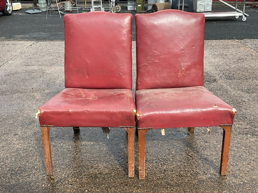 A pair of Georgian mahogany Chippendale style studded leather upholstered chairs with camel backs and flared rectangular seats, raised on chamfered square legs. (2)