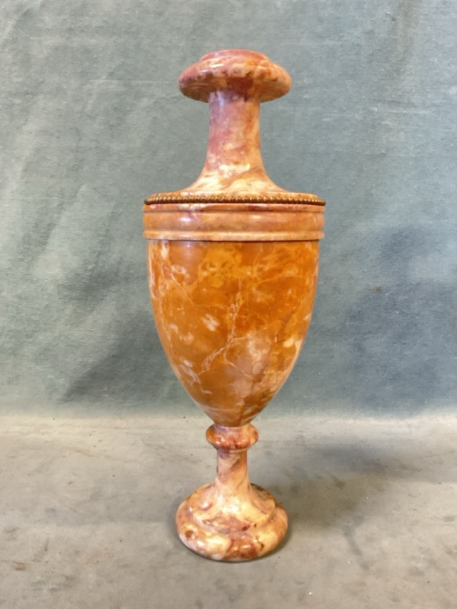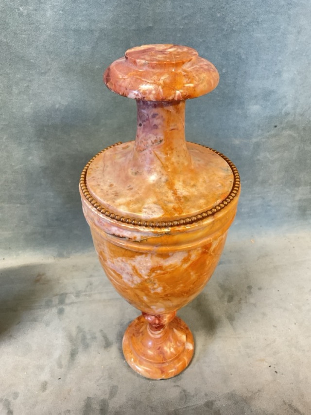 A pair of vase shaped sienna marble urns with waisted necks having ormolu bead moulded shoulders, on turned socles. (14in) (2)