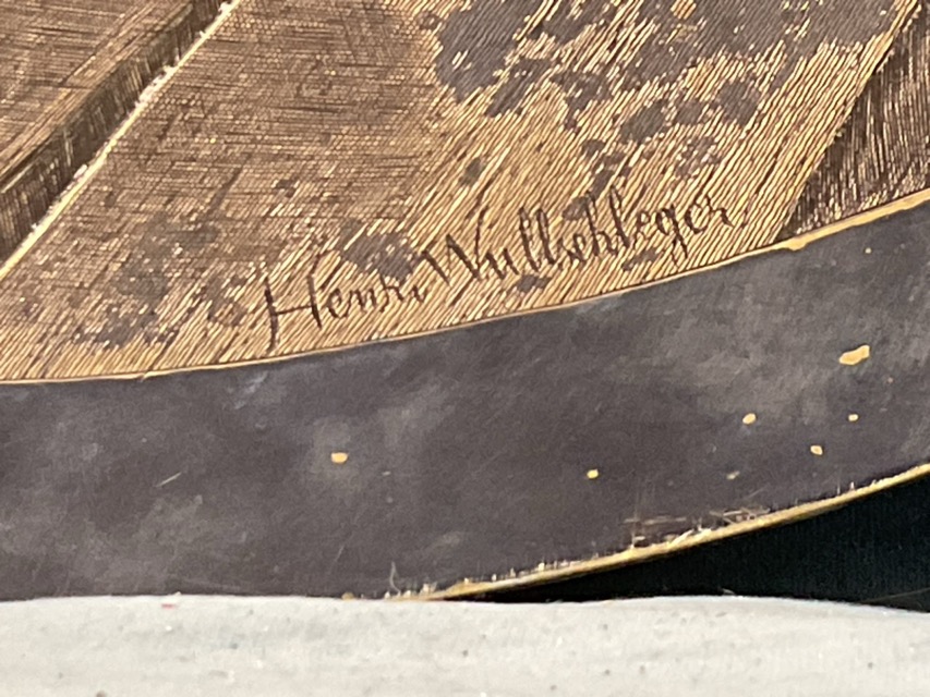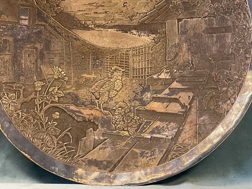 Henri Wullschlager, a C19th circular concave part-silvered brass plaque moulded and chased with a moonlit scene of a farmyard and chicks locked out of a henhouse, with landscape beyond, signed. (21.75in)
