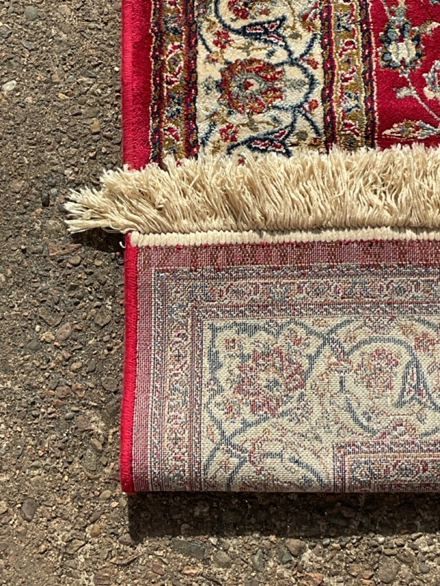 A Kashmir style rug woven rug with floral medallion amid scrolling foliage and blossoms on a red field, within a flowering vine border. (65in x 45in)