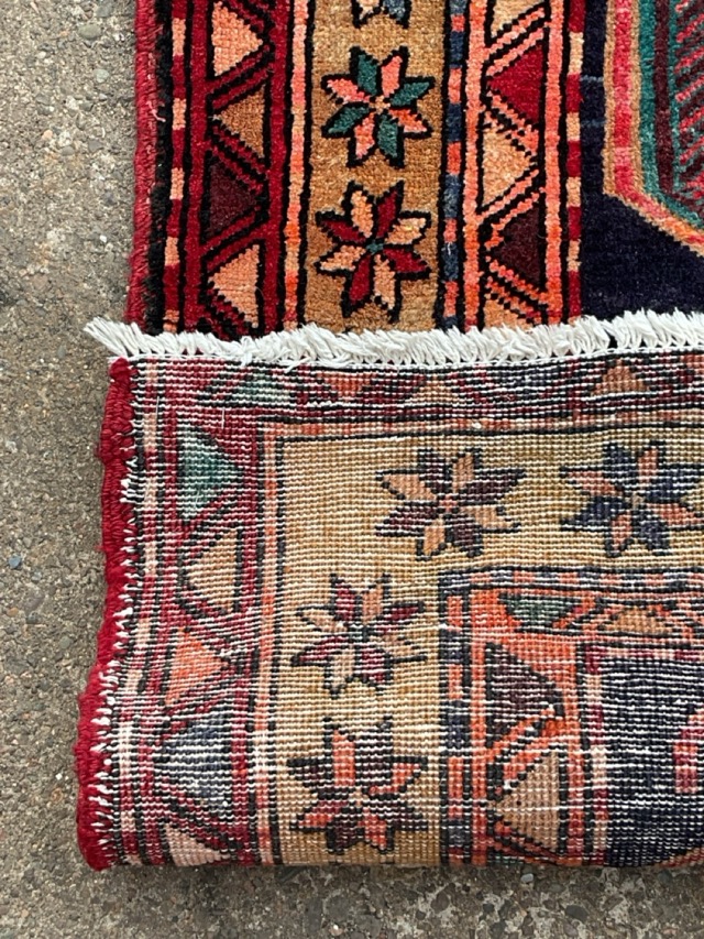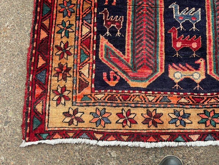 A Heriz wool runner woven with two Lenkoran crab motifs on a blue field amid stylised animal, bird, and human figures, within meandering vine and flowerhead borders. (129in x 51in)