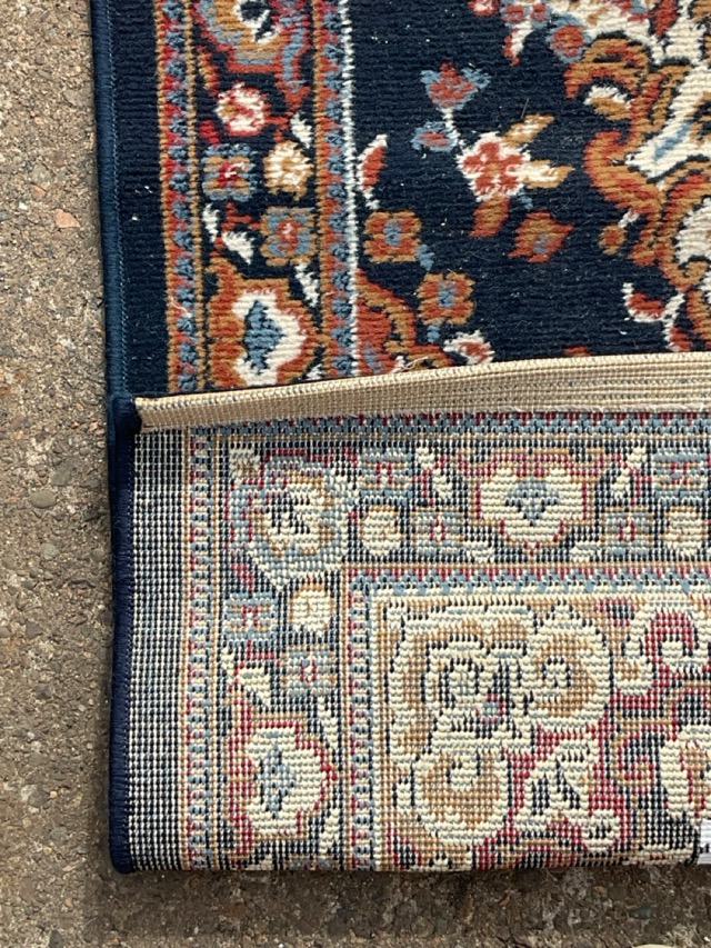 A Belgian rug woven with scrolled foliate medallion and conforming spandrels amid scattered floral sprays on a blue field, within meandering blossoming vine borders. (59in x 30in)