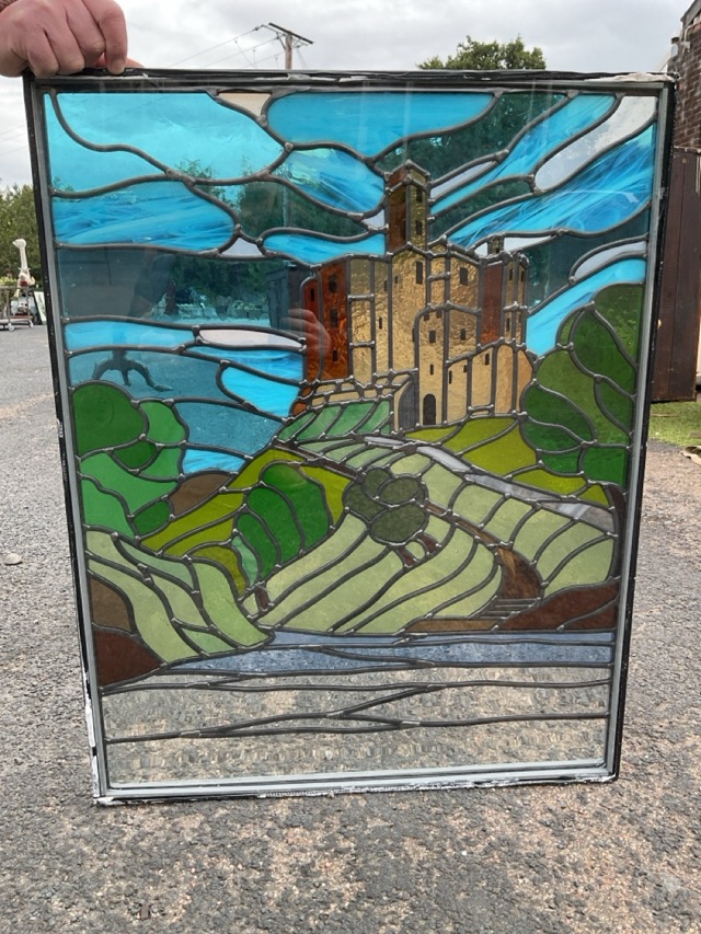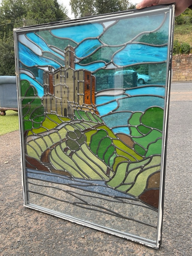 A leaded stained glass panel depicting Warkworth Castle, encased in glass panes, fitted for a door frame, unsigned. (23.5in x 29.5in)