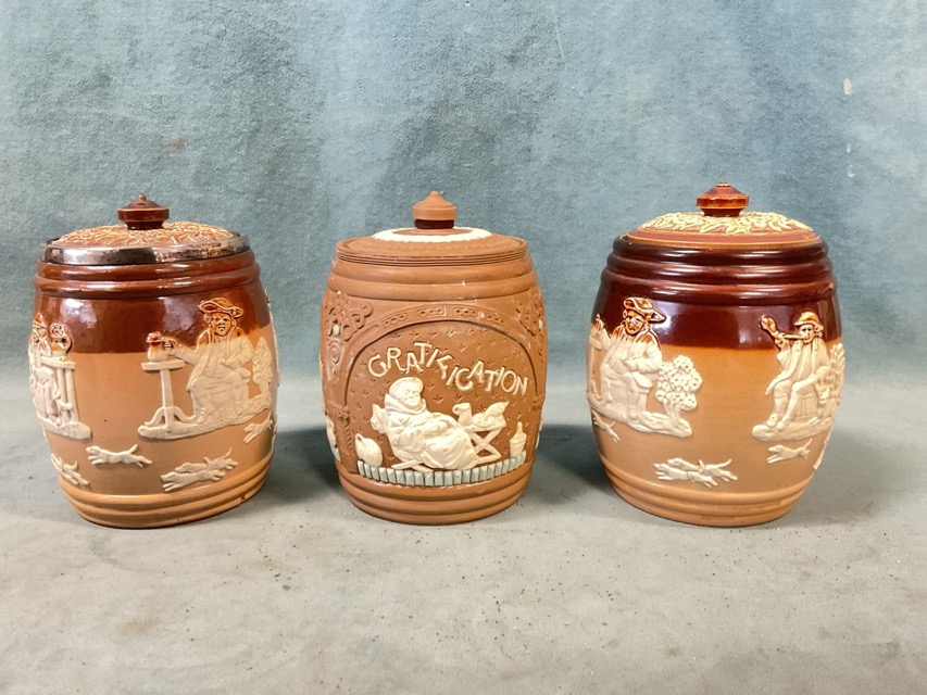 Five Victorian/Edwardian Doulton Lambeth stoneware tobacco jars - sprigged hunt scenes, hallmarked silver London 1891 & 1902, comical monks, floral band, and a German jasperware style urn. (6)