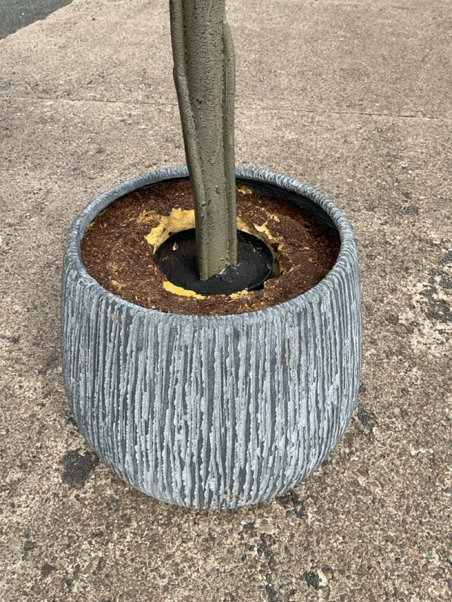 A large 8ft indoor decorative artificial tree, set into a ribbed faux-slate ovoid pot. (A/F) (97in)