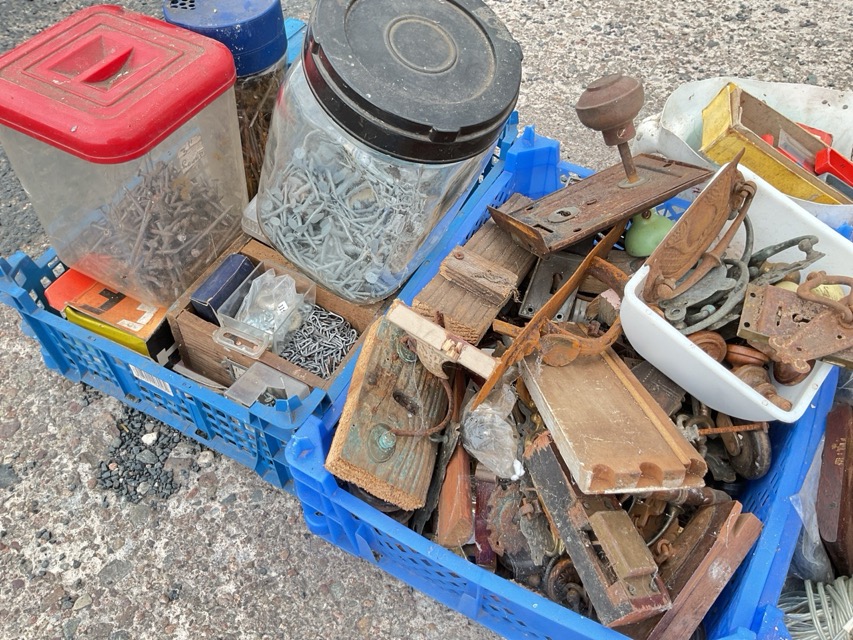 Miscellaneous materials - cabinet handles, nails, screws, galvanised clouts, brass upholstery studs, door furniture, knobs, pins, castors, brass, drills, staples, etc. (A lot)