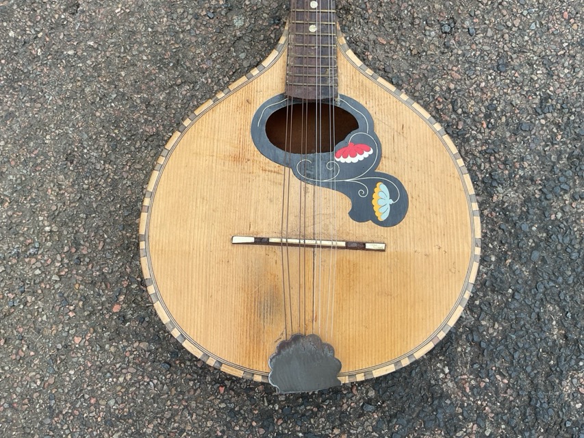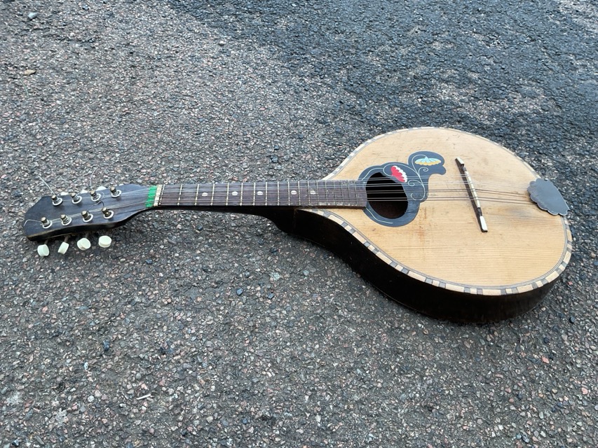 A cased Italian eight-string mandolin with inlaid ebonised panel framing shaped soundhole, having pine body with chequered inlaid purfling, the neck with brass frets & machine heads. (24in)