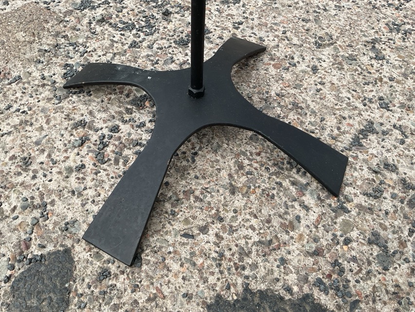 A wrought iron and copper candle stand with ruby glass shade in a copper frame with dished triangular drip pan, on a cylindrical column raised on an arched cruciform base. (71in)